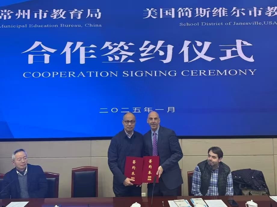 In the morning, the Janesville Public School District delegation arrived at the Changzhou Education Bureau and received a warm reception. A formal cooperation signing ceremony was held afterward, with the Deputy Director of the City Government’s Foreign Affairs Office and representatives from the Changzhou Education International Exchange Association attending the meeting. During the meeting, leaders from the Changzhou Education Bureau and the Deputy Director of the City Government’s Foreign Affairs Office introduced the current status and development prospects of education in Changzhou, while Director Chris presented an overview of education in Janesville. At the same time, the Changzhou Education International Exchange Association shared its experience and achievements in foreign cooperation and exchanges. On this basis, the Janesville Public School District, Changzhou Education Bureau, and Changzhou Education International Exchange Association signed a memorandum of cooperation.