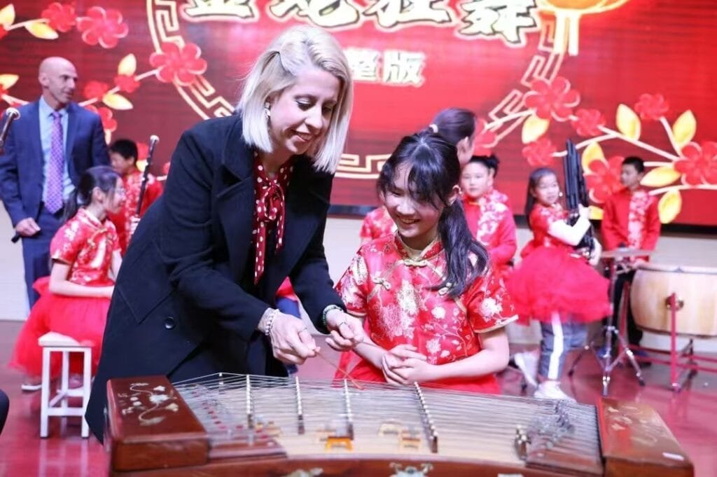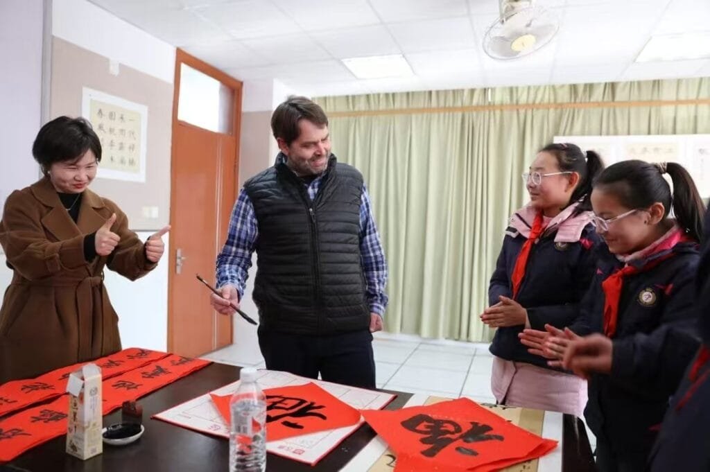 In the afternoon, accompanied by Jiang Yue, the Deputy Director of the Changzhou Education Bureau Office, the delegation visited the elegant campus of Sanjing Experimental Primary School in New North District. Led by the school’s principal, the delegation toured the campus and enjoyed a traditional Chinese music performance, “The Mad Dance of the Golden Serpent,” prepared by the students. The delegation members then participated in a calligraphy activity for the Chinese New Year, writing Spring Festival couplets with the students. Teachers from both sides also held discussions on educational philosophies, teaching methods, and student activities, sharing their educational experiences and insights.